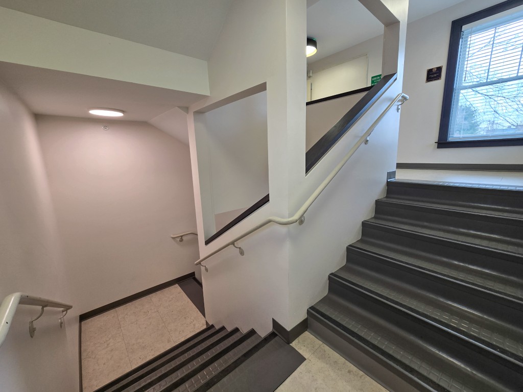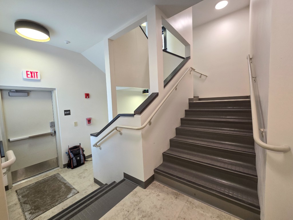 - The egress stair tower starts with concrete walls and footings in the basement and extends up to the 3rd floor dormitories.