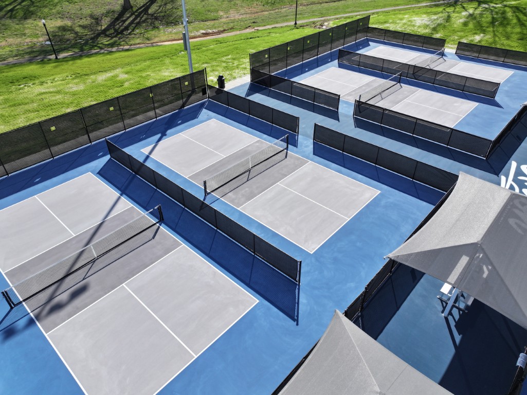 - Eight multi-colored, post-tensioned concrete pickleball courts